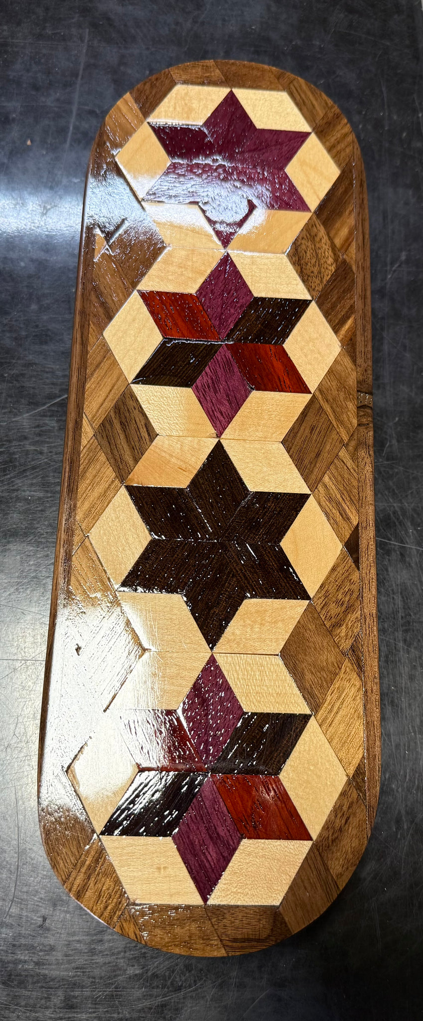 4"X12.75" approx. size. Assorted woods, bubinga, wenge, walnut, purpleheart, maple, and walnut .